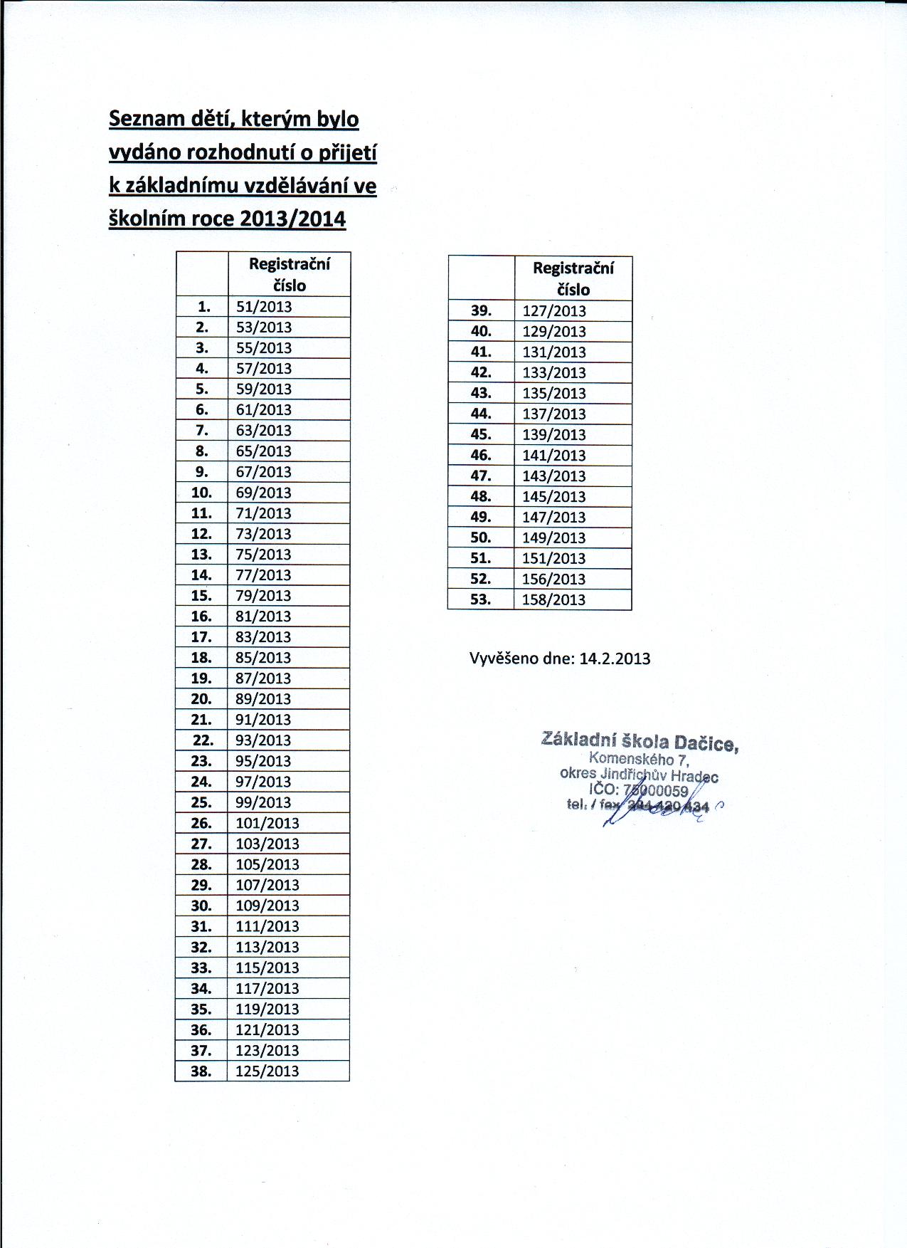 přijatých uchazečů vedených pod příslušnými registračními čísly.